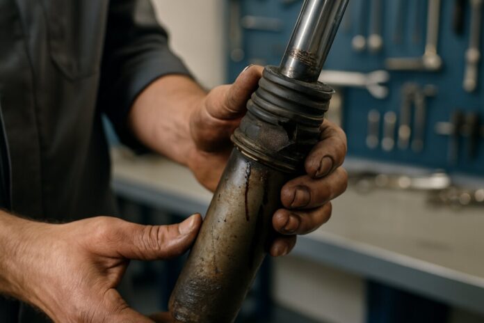 Visible hydraulic fluid on the shock body confirms internal seal failure. Fresh leaks appear wet and may attract road dust. Older leaks leave dried, crusty deposits. Any leak indicates the shock has lost damping fluid and can’t function properly, regardless of how minor it appears.