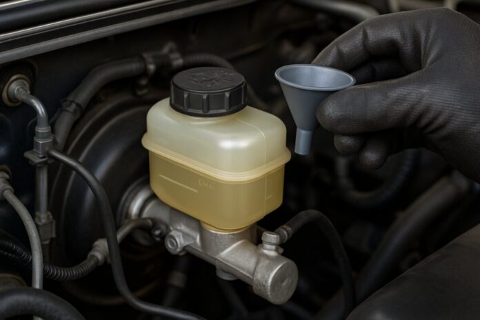 Using a small funnel, slowly add fresh brake fluid to the reservoir until it reaches the maximum line. Pour slowly to avoid creating air bubbles, which can affect hydraulic pressure.