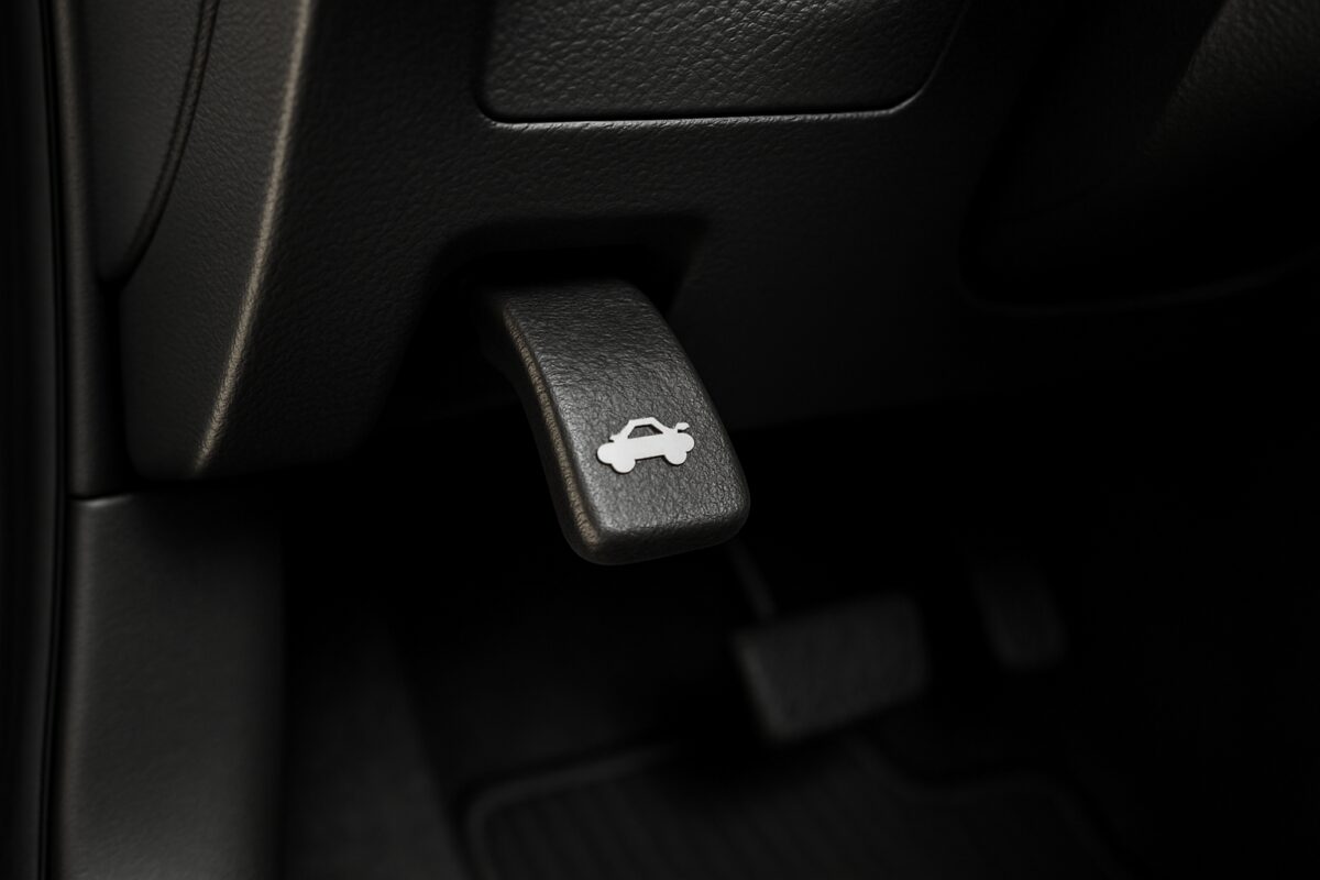 Position yourself in the driver’s seat and look down towards your left foot area. The Toyota Aygo bonnet release lever is located on the left side of the driver’s footwell, mounted on the lower dashboard panel near where your left knee would rest.