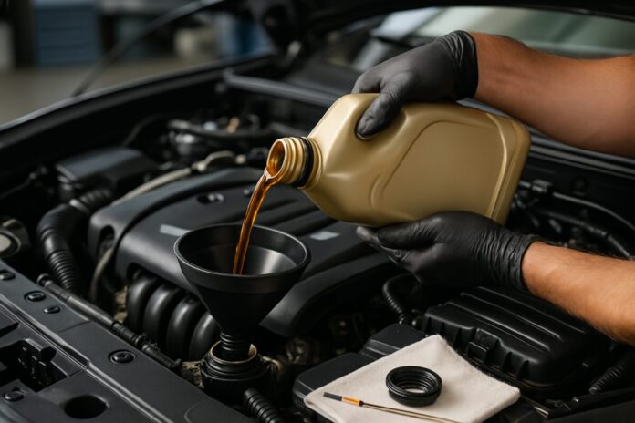 Replace the oil filler cap tightly and remove the funnel. Start the engine and let it idle for 2-3 minutes, watching for any leaks around the oil filter or drain plug.
