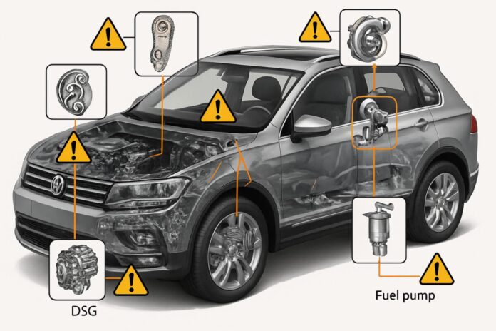 DSG gearbox failures, timing chain tensioner issues, turbocharger problems, and high-pressure fuel pump failures represent the most frequently reported problems across VW Tiguan model ranges.